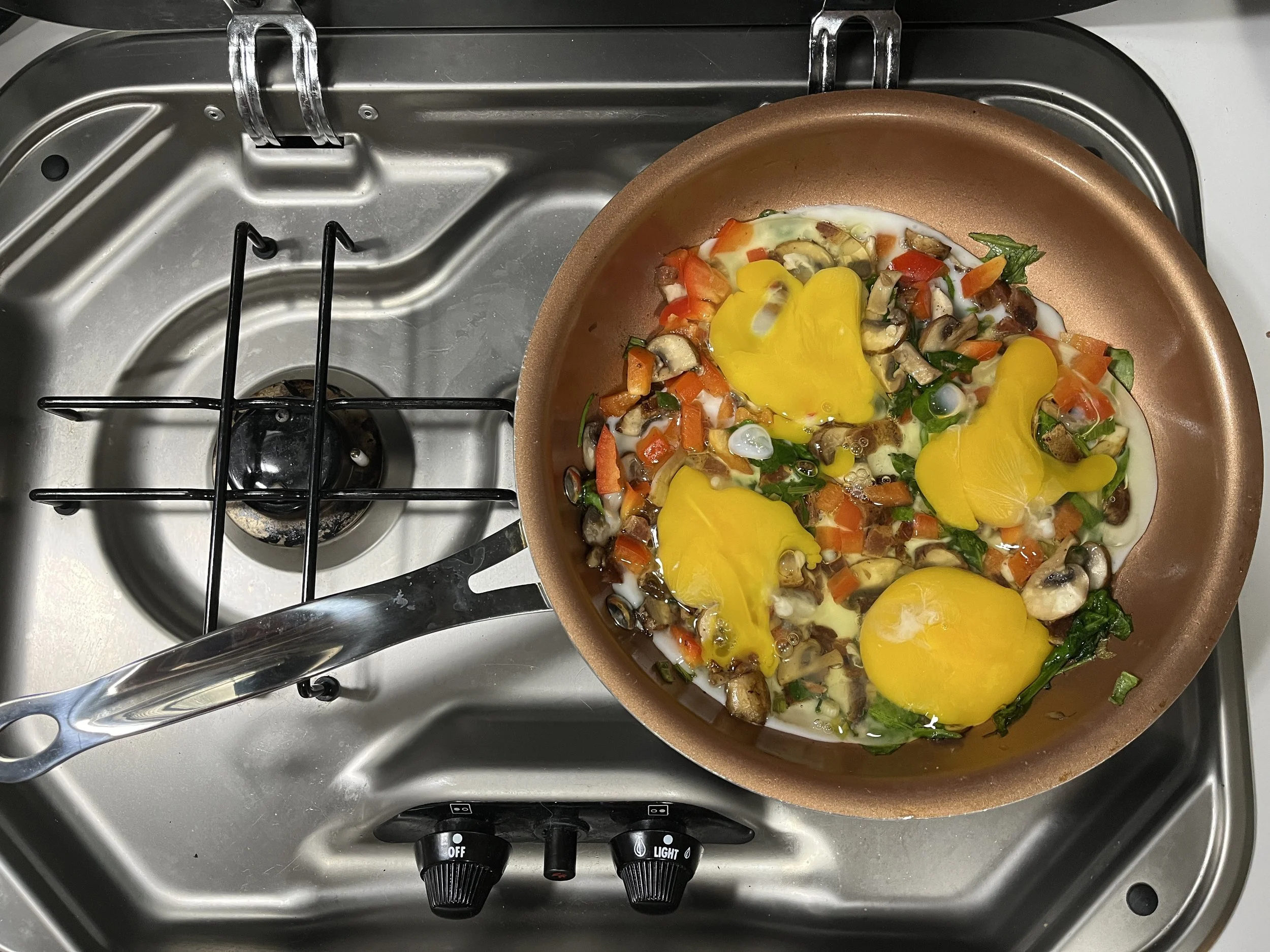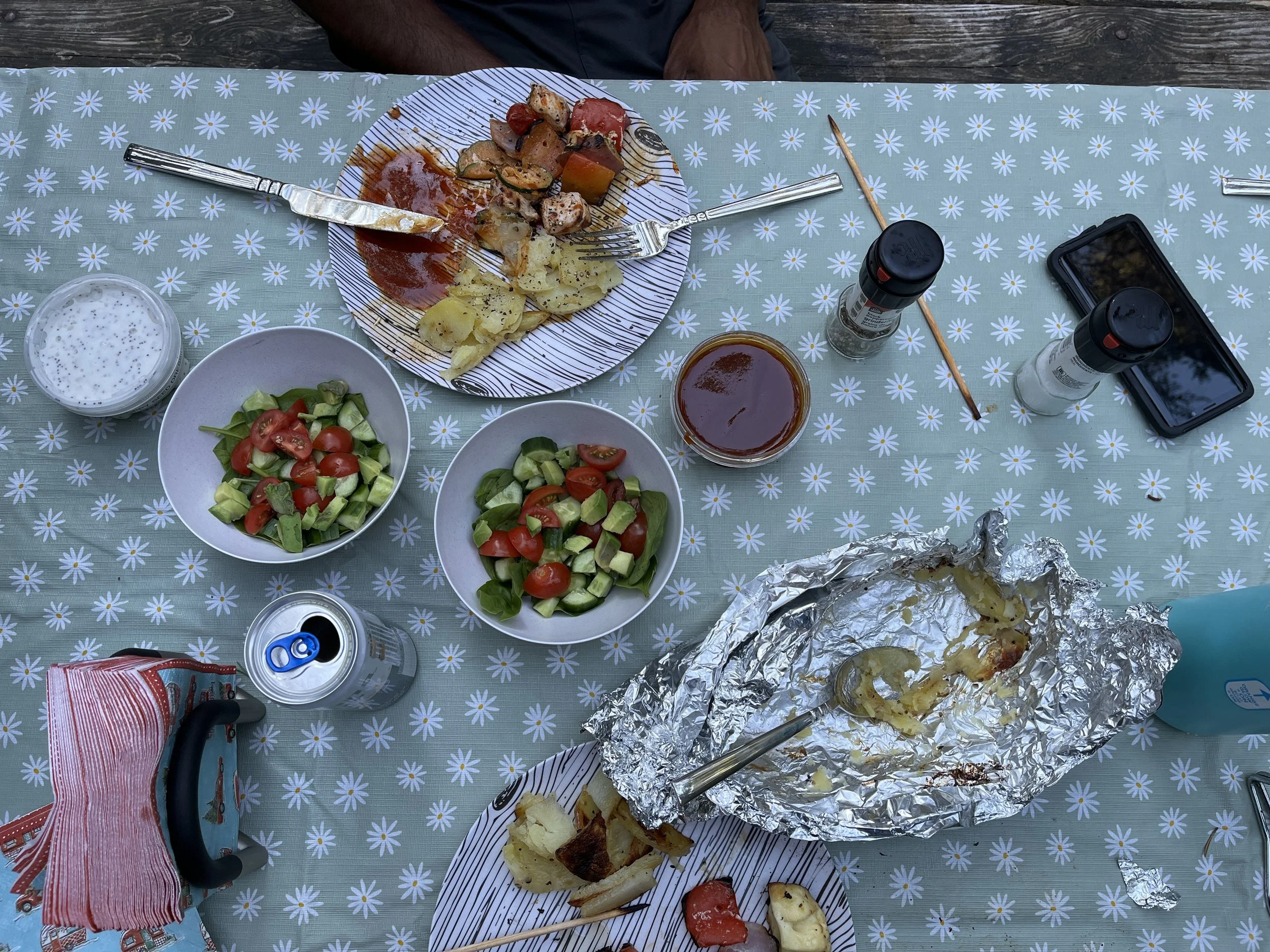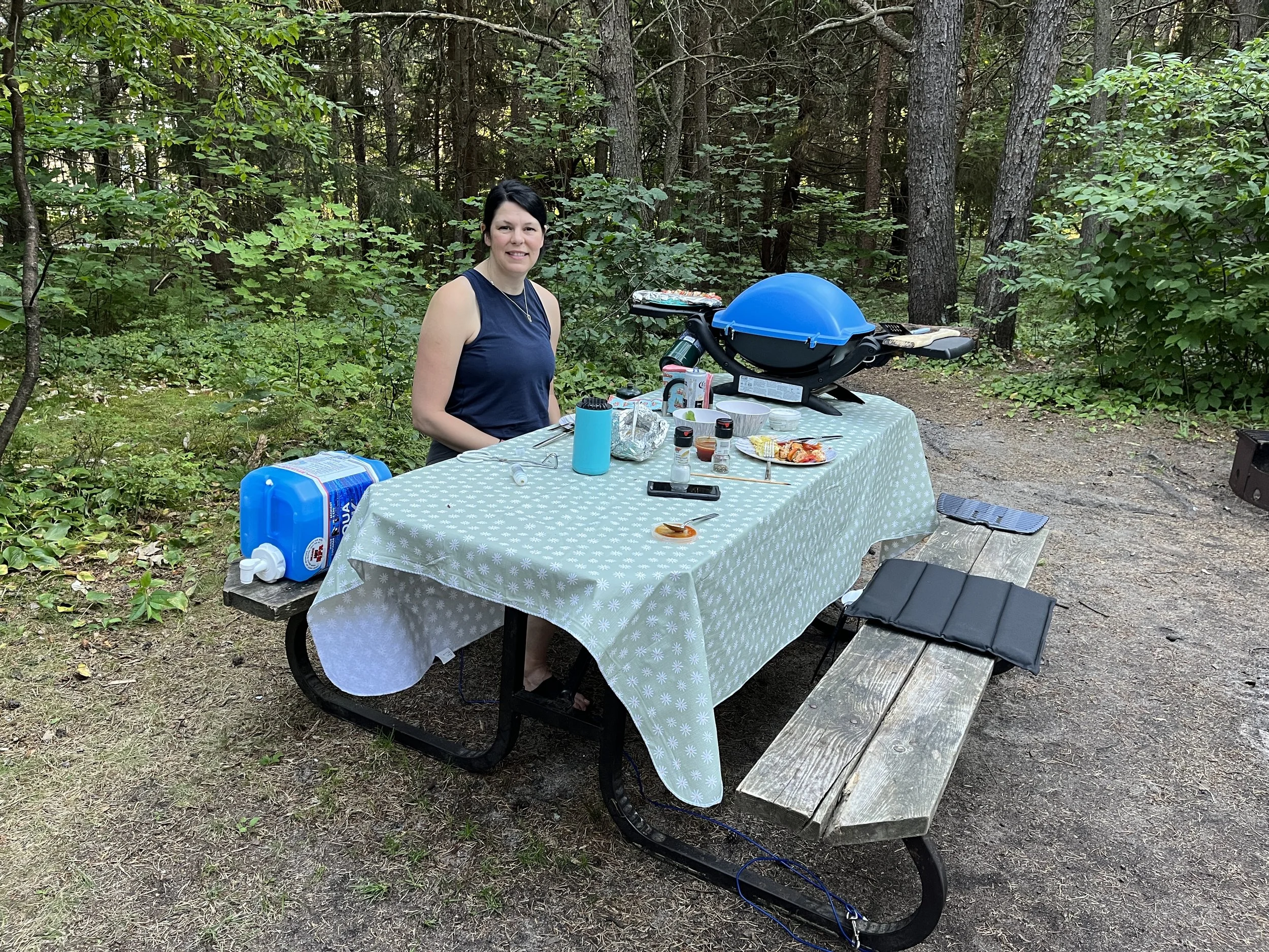 Supper was skewers (thank you Farm Boy!), potatoes and salad. We ate outside despite the mosquitos being out in force. We used our thermacell and it was helpful, but not 100%. We didn’t linger at the picnic table.
