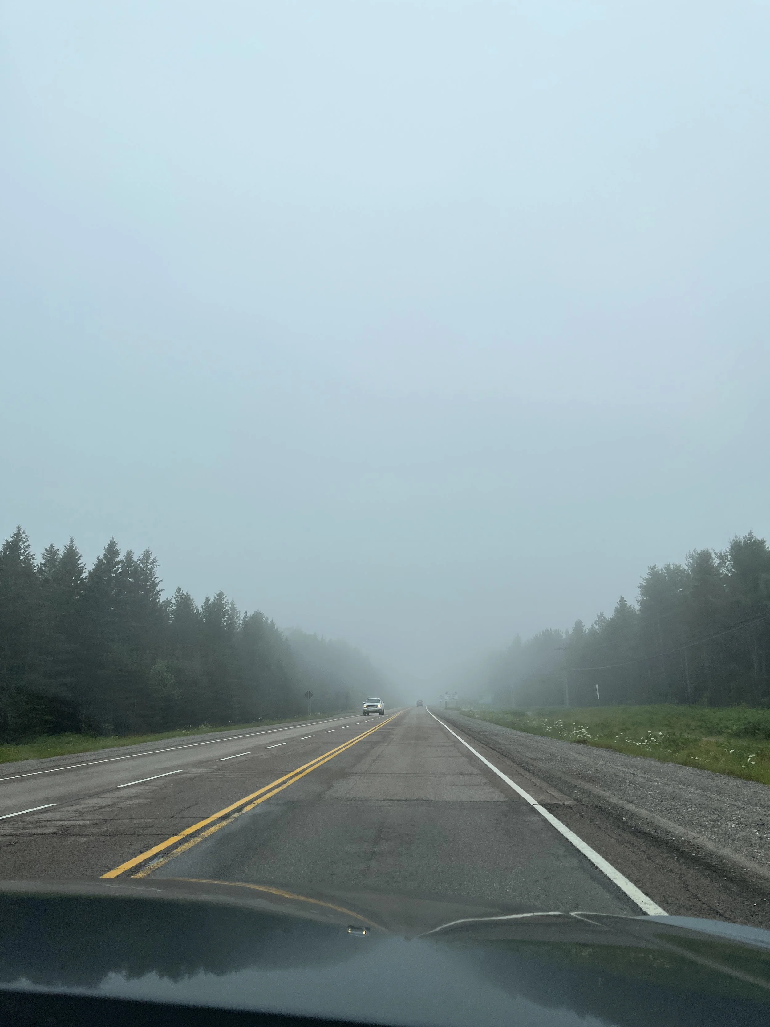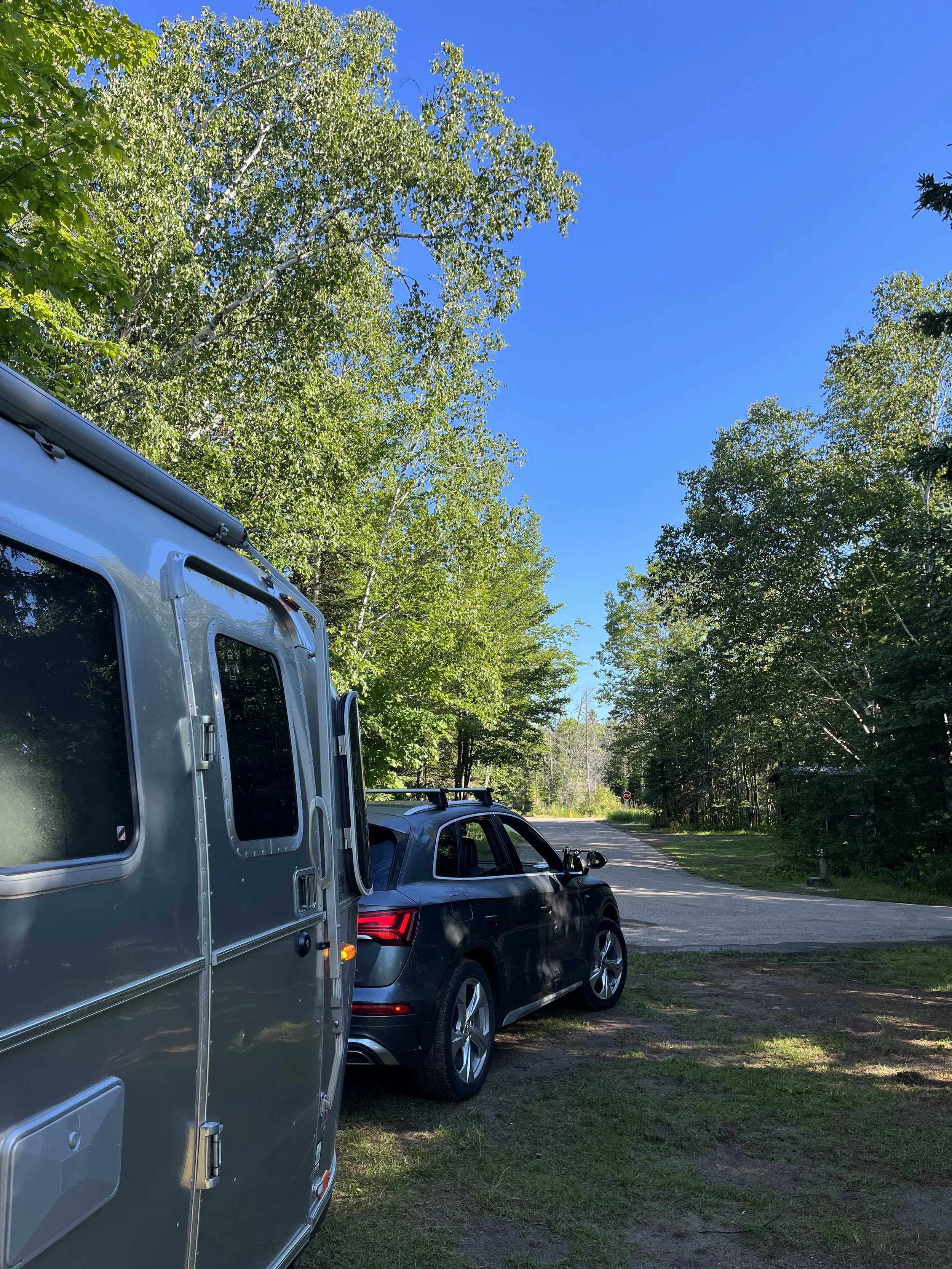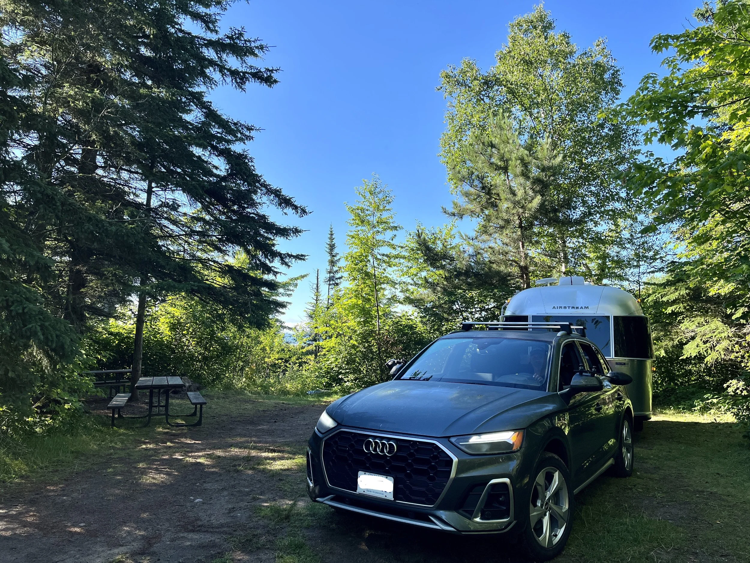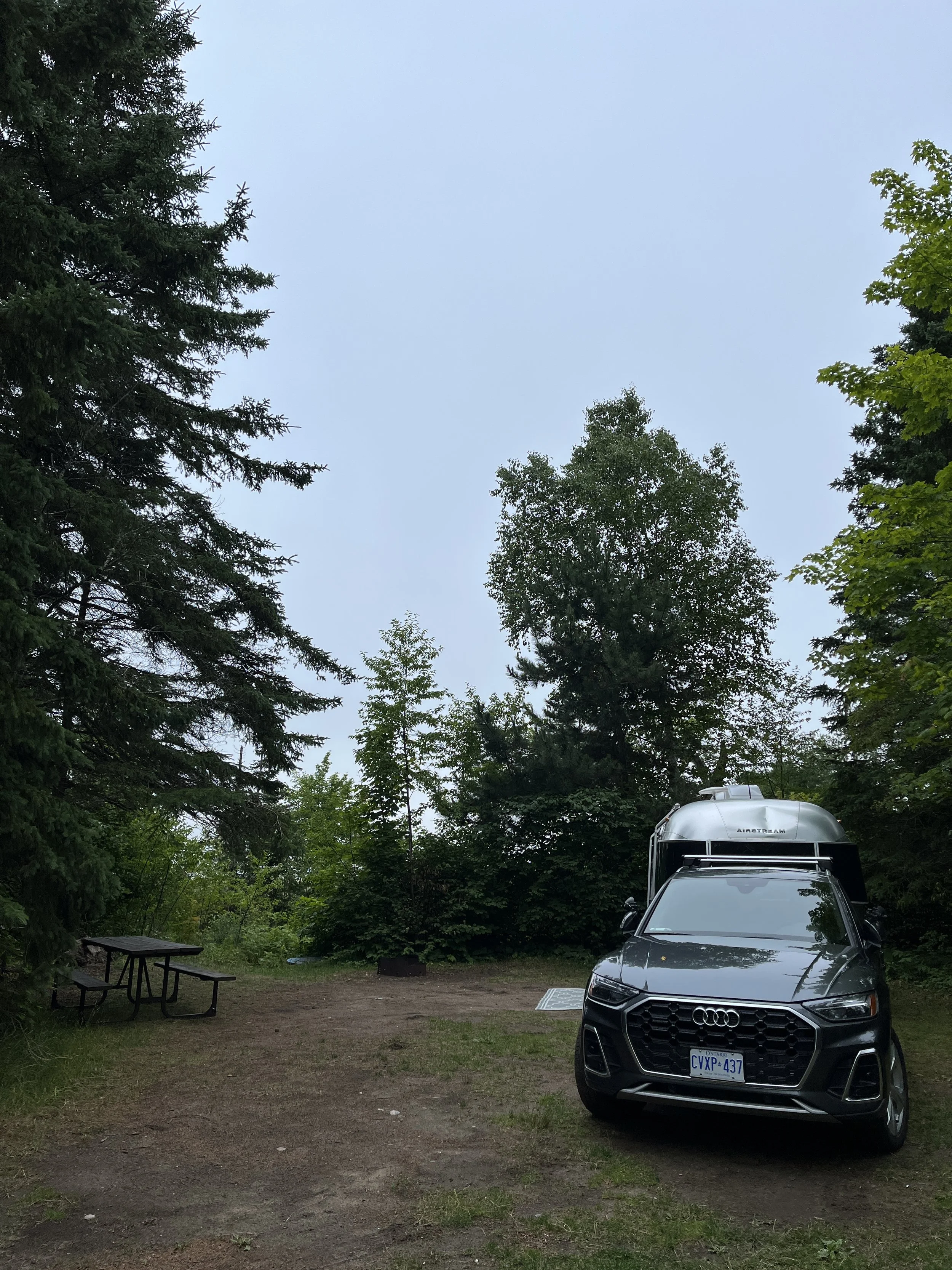 From Chutes, we continued west through Ontario towards Pancake Bay Provincial Park. We started out with some rain and clouds most of the way to Sault St Marie, where we stopped for a walk in the big park by the water. We were met with quite a bit of fog and some rain for the rest of the drive to Pancake Bay.