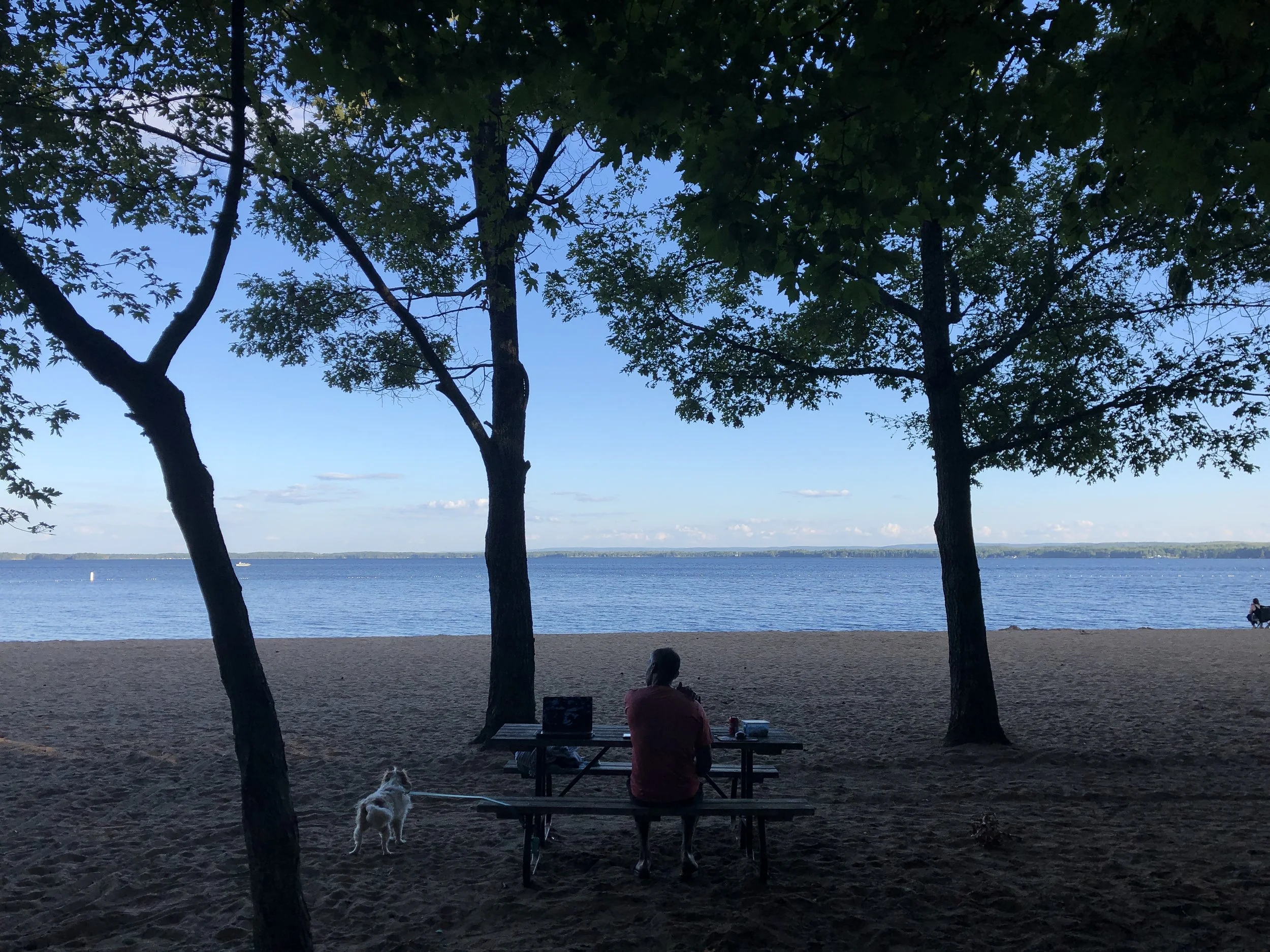 I finished my book, had some nectarines (so fresh and delicious!) and then took Daisy to the beach to meet Chris and do some of my own work. We talked to Josh for a few minutes as well - he was heading back to school for his last semester in Sudbury. It was a busy morning! We headed back to our site at around 1 pm so that Chris could go for a run. I ate lunch instead.