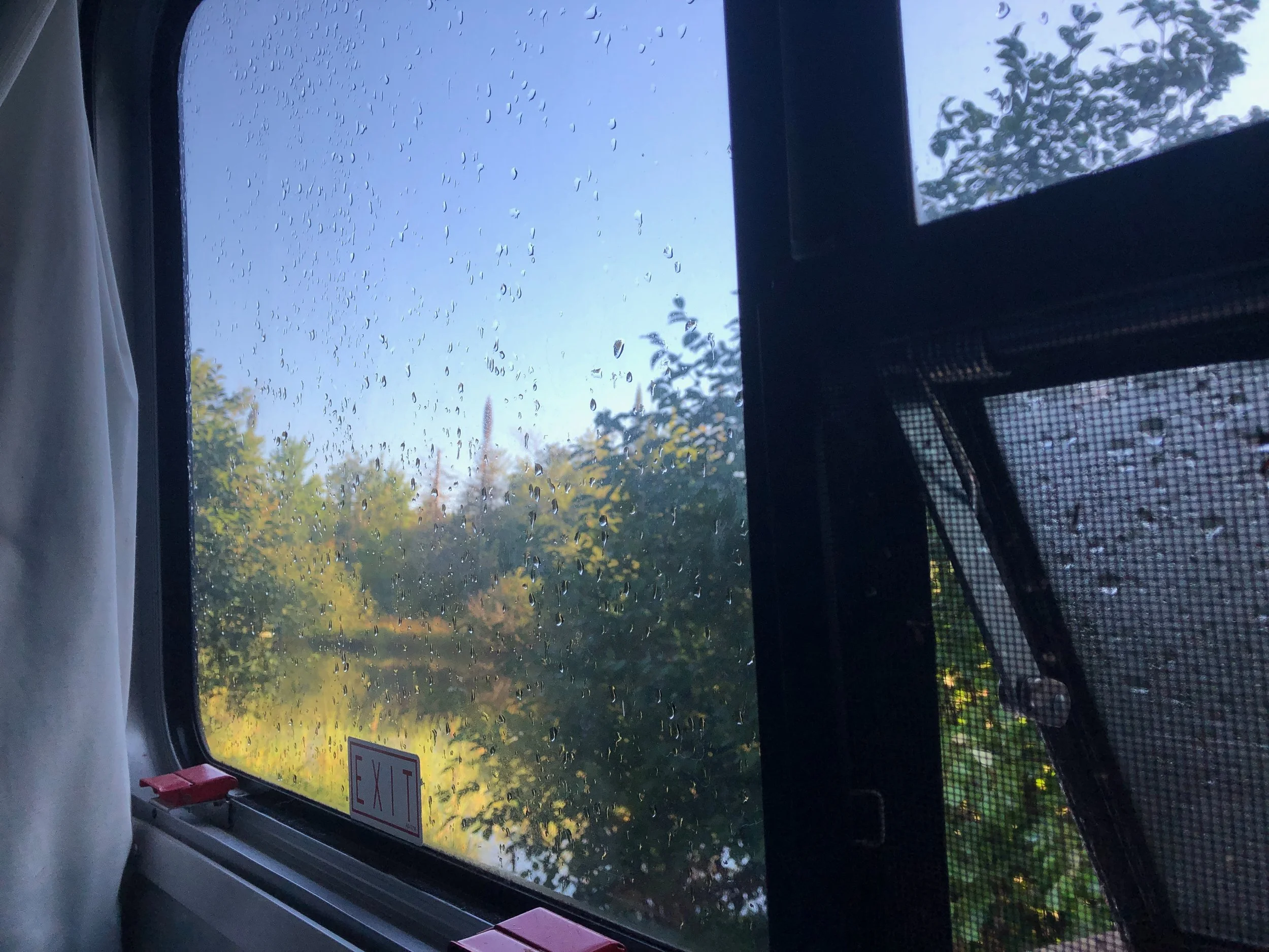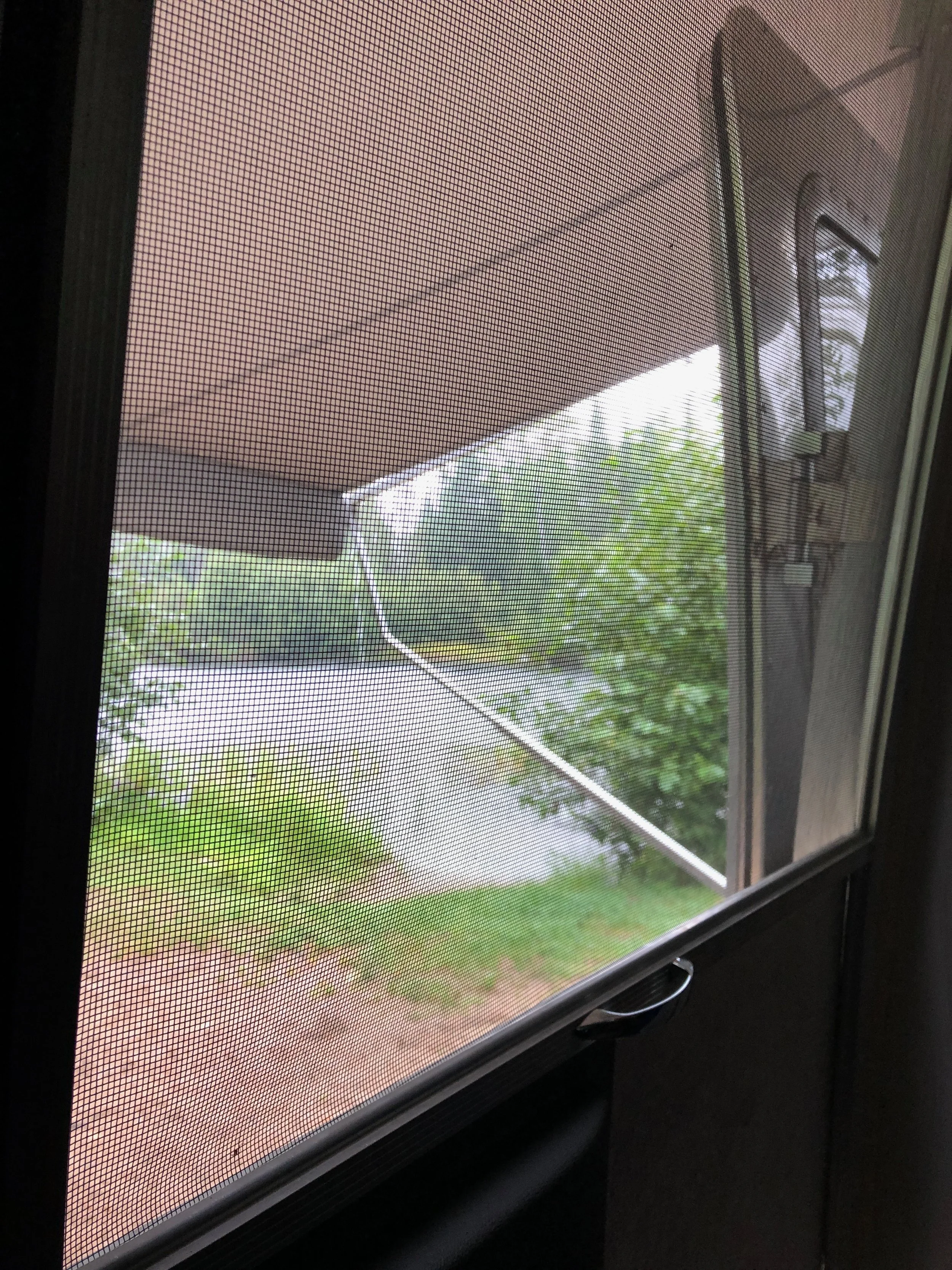 Even with the awning out, the rain was coming in a bit, so we closed the door. The thunder and lightning continued for the rest of the evening (until just past midnight?) and we had quite a show with tons of lightning. It really poured for a bit and then turned into a steady rain.